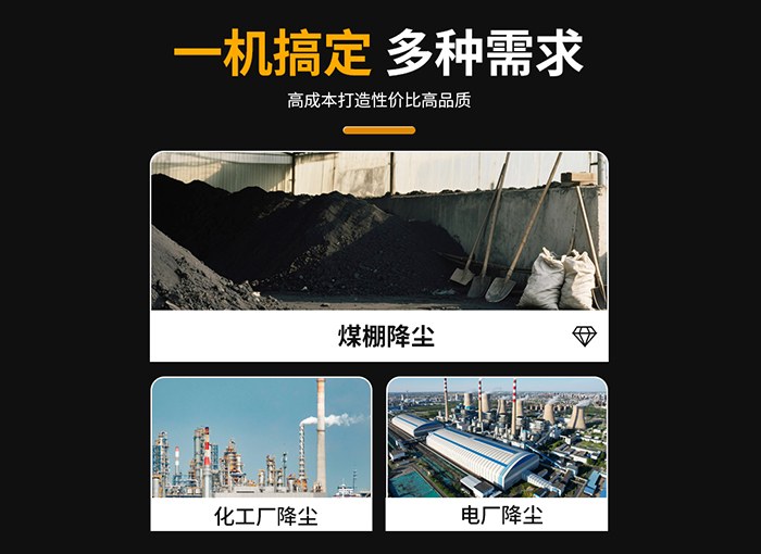 主要用于建筑工地、矿山堆场、港口码头、煤场、矿场、电厂、水泥厂、焦化厂等场景的高效降尘。